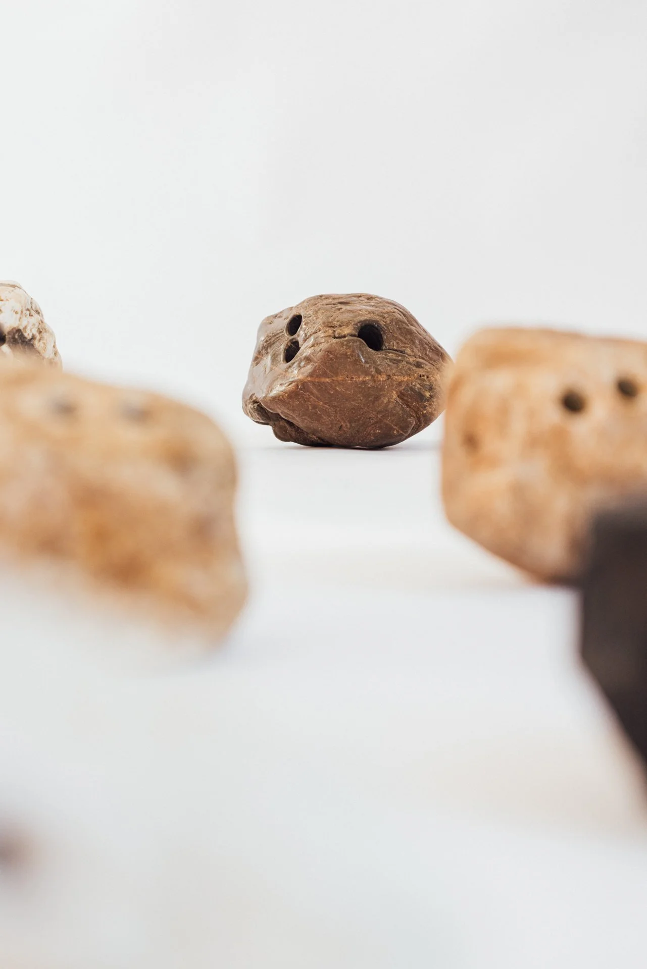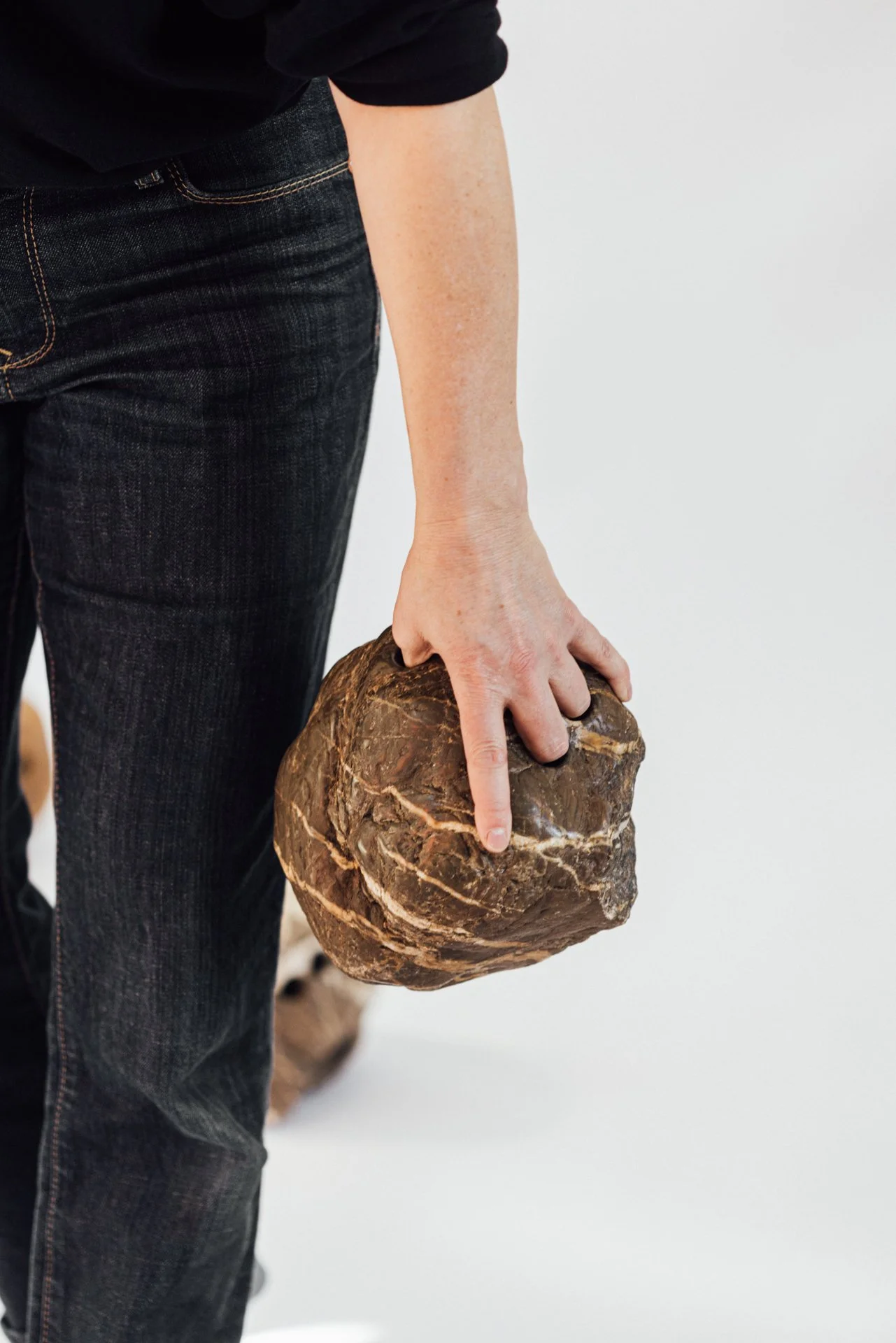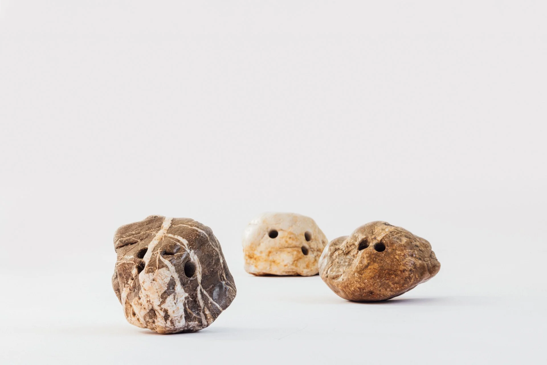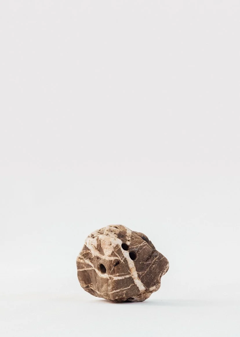 I make three holes in them for grips. Putting your fingers in the holes feels pleasant; you get close to the core of such a heavy stone. The stone evokes the natural and static, the inanimate... the holes represent culture, action, and movement.